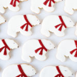 Our polar bear sugar cookie is white with an adorable face and a stylish red glitter scarf. It comes packaged in a clear cello bag with a gros grain ribbon bow. Oh, and it tastes delicious too!